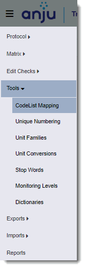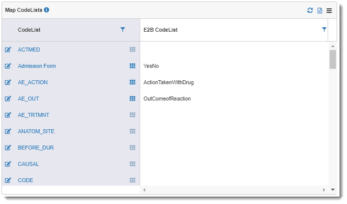 You can view a list of E2B CodeLists that are mapped to each item, such as an AE (Adverse Event), .ETHNIC (Ethnicity), or Country.